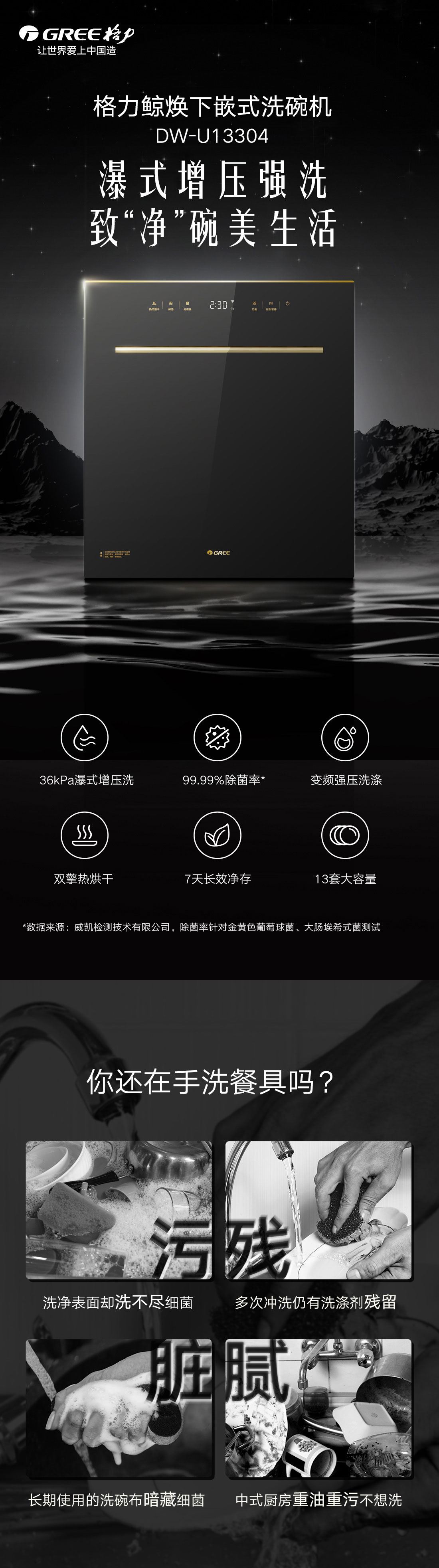 搭載瀑式增壓強洗科技,36KPa洗凈深層菌污,除菌率達99.99%;洗烘除存一體,存放7天也干爽